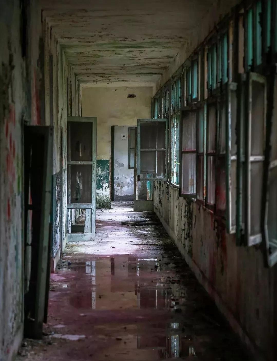 空旷的走廊,蓝绿色和泛黄墙面相结合,水管早已锈迹斑斑,处处都透露着荒凉。天花板也泛起了常年下雨留下的霉印,顺着墙面一直霉到地面。