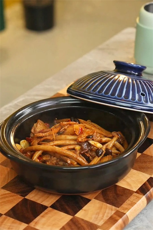 6、找一个小砂煲加热后,把炒好的菜装进去,再端上桌即可。