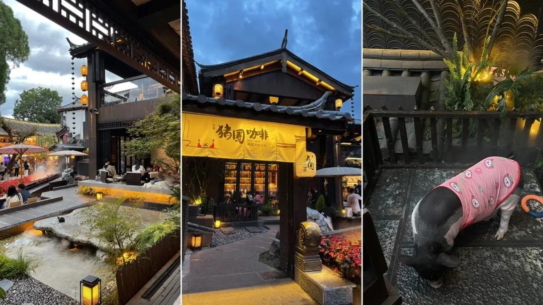 丽江猪圈咖啡设计成一座古色古香的中式建筑,专门划出小香猪活动区域,网友调侃“连猪都变得古色古香”。