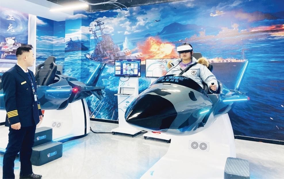来到教育基地二楼,只见宽敞明亮的大厅内陈列着各种先进的模拟设备,环绕式的大屏幕,呈现出逼真的飞行场景,让人仿佛置身于云端之上。“这是裸眼9D飞行影院,160°弧形大屏幕搭配六轴动感平台,可模拟加速、俯冲、摇晃等动作,加入吹风、喷水、泡泡、雪花等特效,可以带来视觉、听觉、触觉等全方位感官体验。”肖龙介绍,青岛藏马航空还将开展多项特色研学活动,让孩子沉浸式感受科技的魅力和开飞机的乐趣,为学生种下飞行梦、航天梦的种子。在专业老师的带领下,孩子们还可以了解飞机的起源与发展,不同种类飞机的用途与特点。此外,青岛藏马航空拥有大量情景课程,游客可体验典型的飞行体验科目,具有视频、语音和视觉提示、飞行操纵辅助提示,无飞行经验的爱好者也能顺利完成飞行科目。