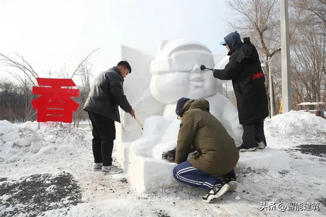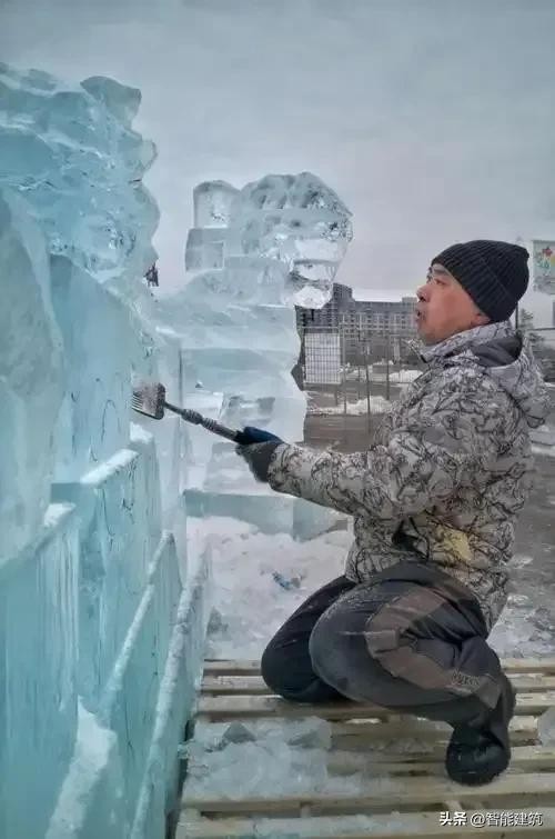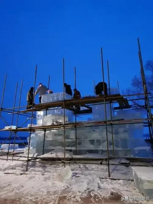冰块运到现场后,首先要进行搭建。艺术家们会根据设计图纸,将冰块层层堆砌,搭建出冰雕作品的骨架。
