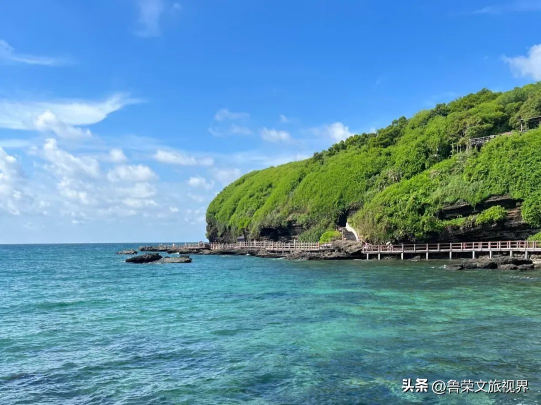 滴水丹屏,绝壁上部绿树成荫,裂隙常有水溢出,形成珠帘垂挂的景观。海水蓝而澄澈,沙滩细腻柔软,是赏日落的好去处 。