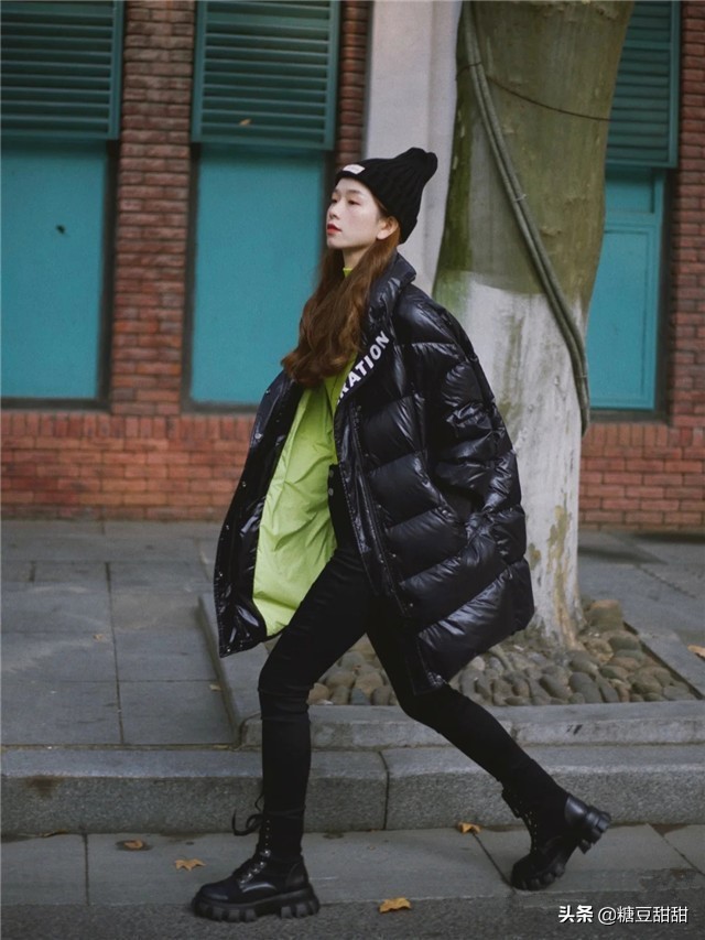 中长款的羽绒服,穿不好就显得很拉跨,不出效果还倒打一耙,内搭一定要干练精致,能拉开身材比例才好,荧光绿这个颜色时髦又好看,很有欧美的感觉,穿成辣妹去炸街,可以参考这一套穿搭哦,内搭的短款荧光绿针织衫,修身勾勒身材,搭配高腰紧身裤更是干练又帅气,马丁靴跟中长款的亮面羽绒服,超赞!气场提升八个度!
