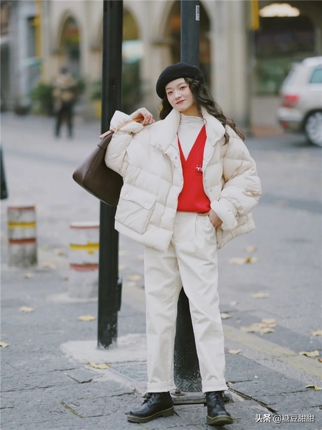 临近年尾了,来一件正红色的单品吧!喜庆又提升气场,白色的半高领打底衫各种脸型都适合,驾驭起来也方便,V领的正红色针织衫叠穿起来,一下就打造出了精致小V脸,短款搭配米白色直筒裤,显瘦显高,短款的白色羽绒服干净利落,黑色的贝雷帽和马丁靴呼应提升穿搭协调度,小个子穿起来超赞!
