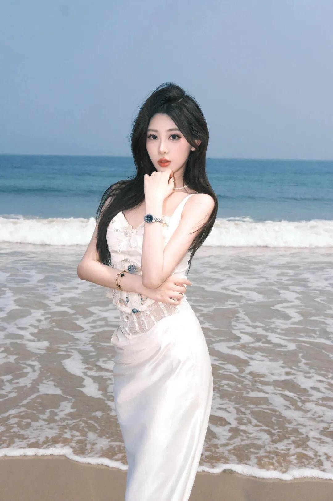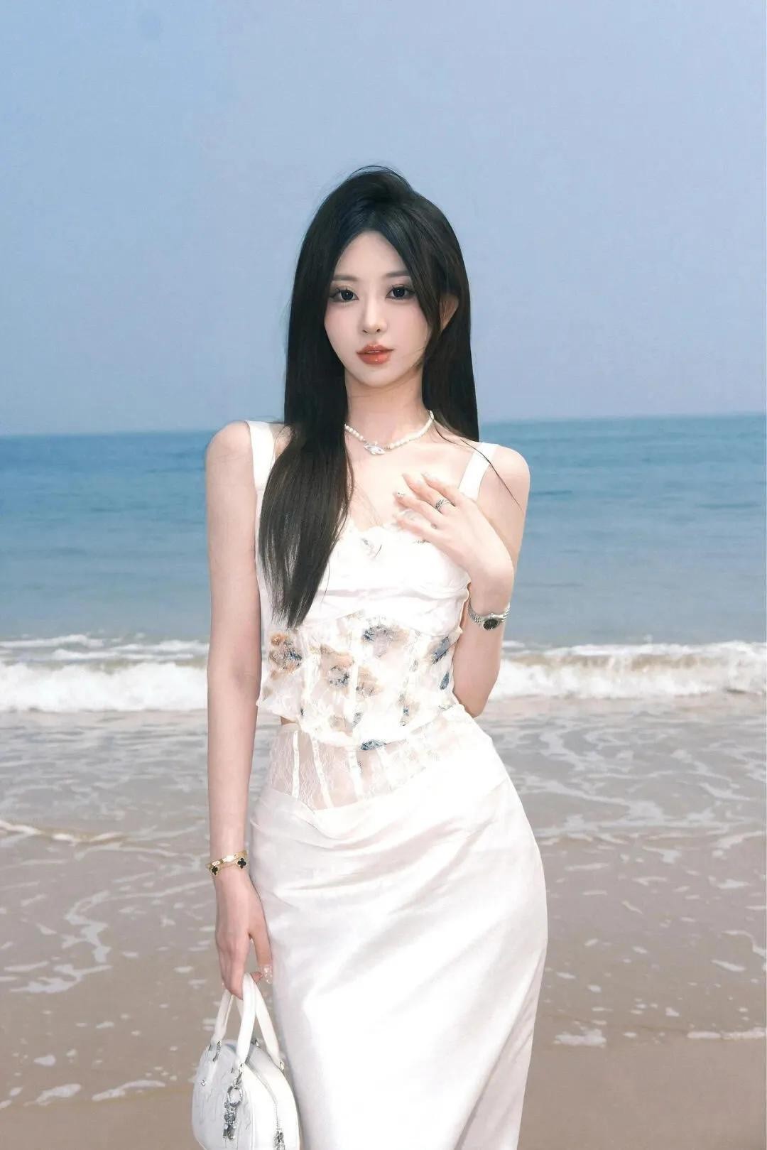 最后这个动作很生活感,但却非常自然漂亮。一手拎着包包,另一手轻捂胸前,像是被海风吹到的一瞬间,眼神望向镜头,自然一笑特别上镜,像是在拍海边日常vlog,轻松又好看。