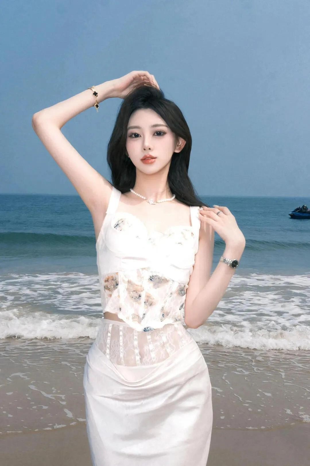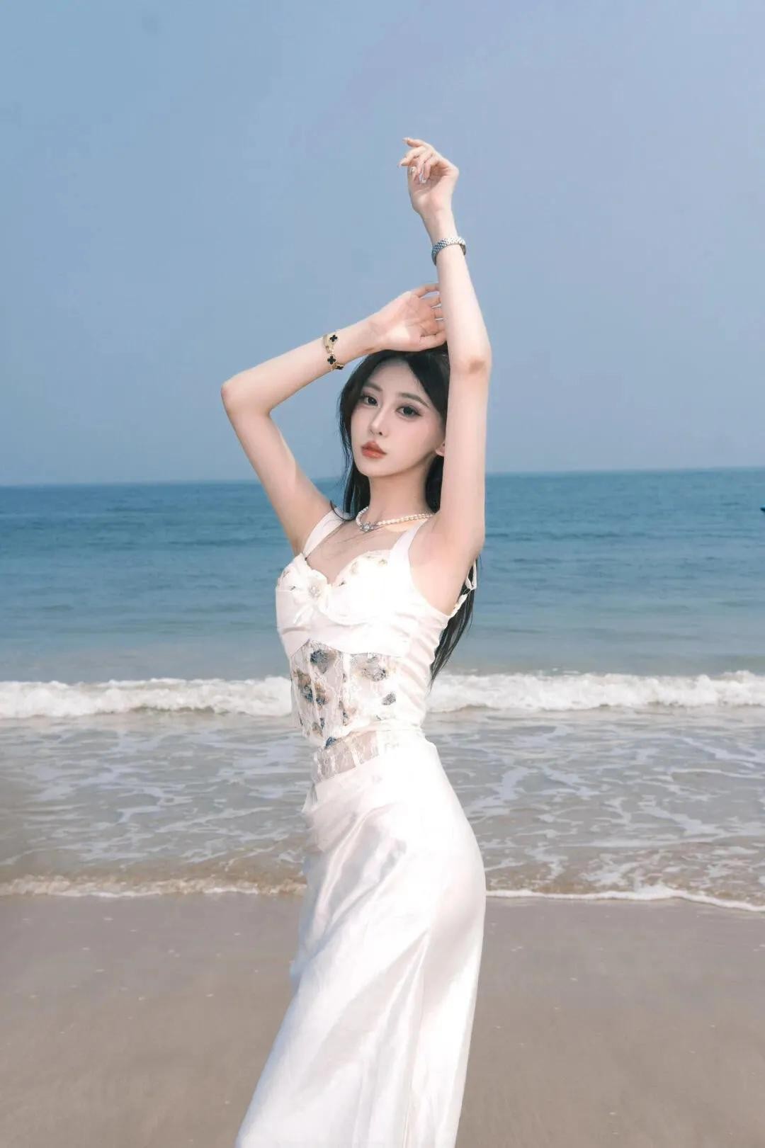 这个动作温柔又灵动。一手轻提裙摆,制造一点动感,另一只手轻轻托住脸颊,眼神望向镜头,整个人看起来就像海风中的精灵,自带柔光,拍照自然又上镜,特别适合穿裙子的海边look。