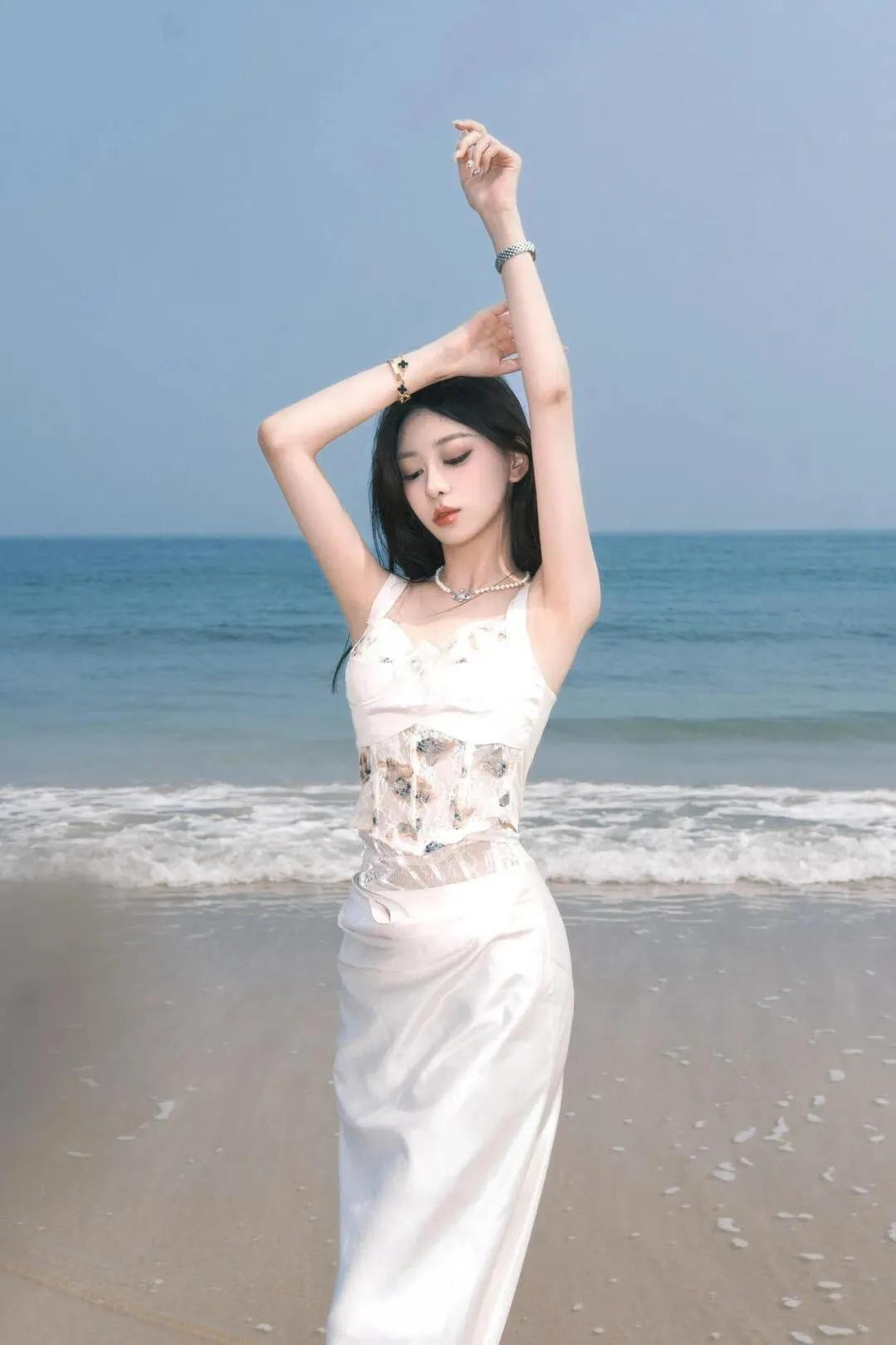 海风吹起裙摆的时候,一定不要错过这个动作。身体侧身,双手轻提裙摆制造动感,然后微微回头笑一下,这种自然流动的美感,最适合海边这种灵动场景,上镜效果特别好看。