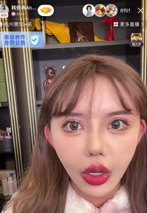 最近,韩安冉现身直播,疑似整容崩坏的长相再次让人大吃一惊。她的脸部线条奇怪,做起表情来像锥子,过度开眼角导致眼睛时刻都像在瞪着,嘴唇过度丰满像是蜜蜂蜇肿了,山根也特别宽。