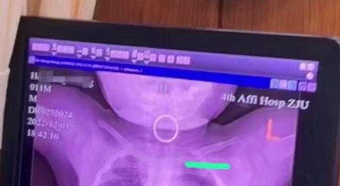 “我接到电话就立马赶到了医院。孩子拍过片子,提示颈部有一个金属性圆环形的东西。我们观察发现,异物不在口腔和喉腔,初步判断这个东西应该在食道入口。”