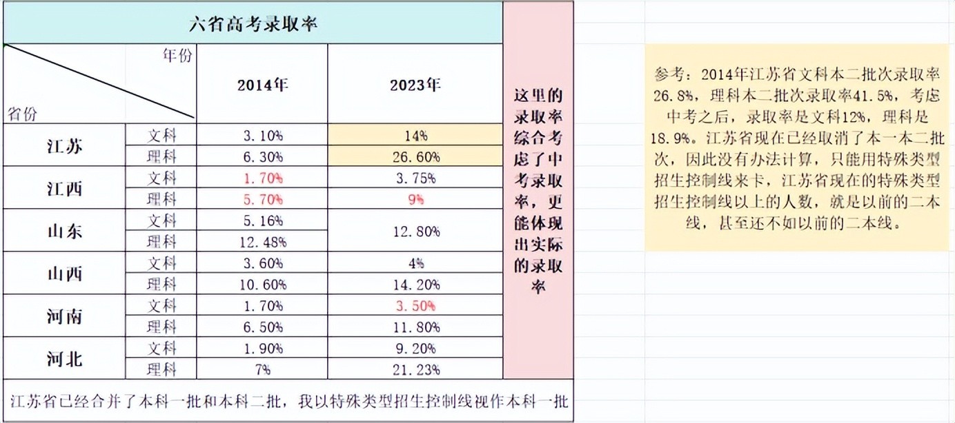 我们来举2014年和2023年两个年份的例子,我选取的省份是江苏省、江西省、山东省、山西省、河南省、河北省这6个省份,来给大家分析一下这几个省份的高考一本录取率,我还会考虑进各个省份的中考录取率,这样能算出来这些省份的相对难度。