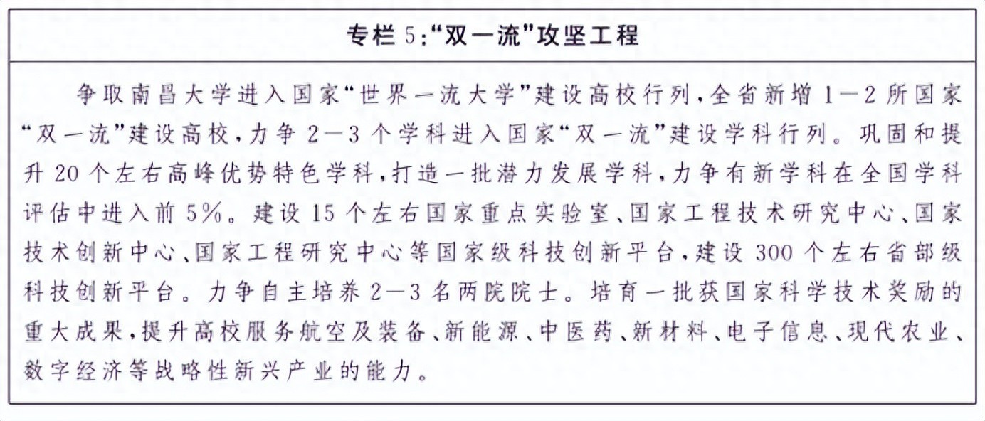 江西省政府2022年4月21日发布了《江西省人民政府关于印发江西省“十四五”教育事业发展规划的通知》,里面提到要推动争取南昌大学进入国家“世界一流大学”建设高校行列,但是2022年2月14日,《教育部 财政部 国家发展改革委关于公布第二轮“双一流”建设高校及建设学科名单的通知》发布,已经不区分一流大学建设高校和一流学科建设高校,因此江西省政府教育规划其实也有待提高,需要根据实际情况进行变更。