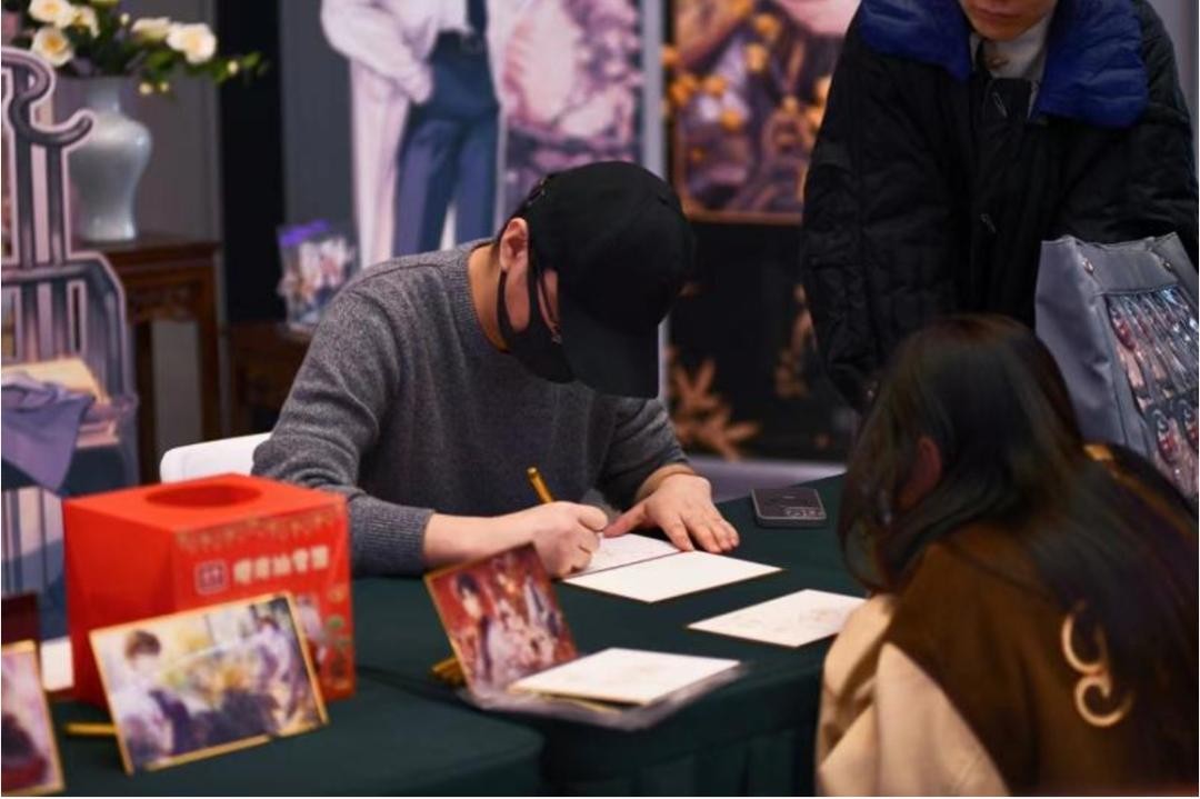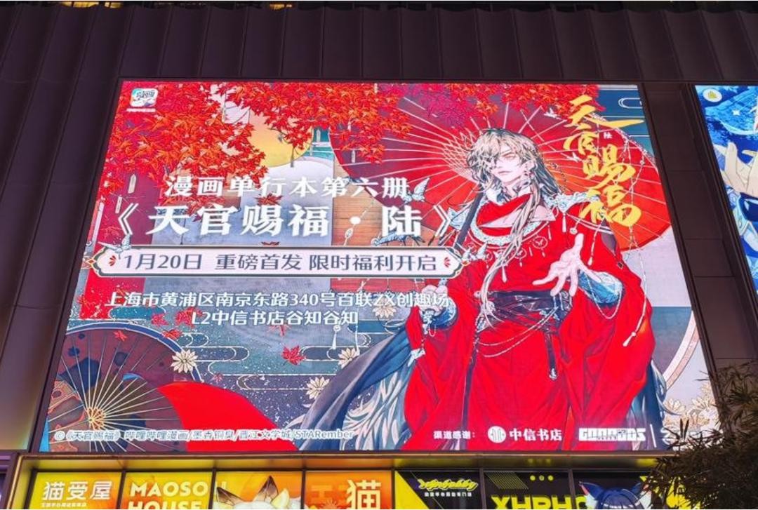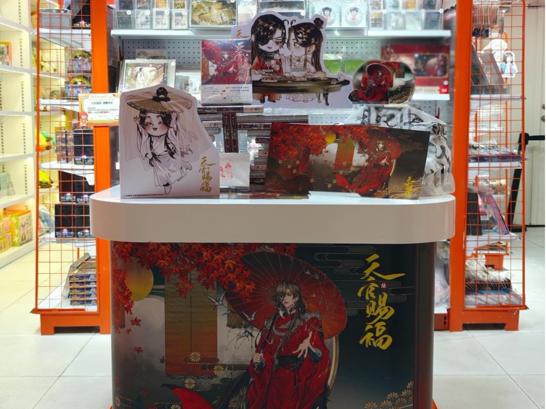 就谷知谷知的经验来看,其依托于集团“自营特典图书+海外进口ACGN图书+国内头部图书”的整体能力,这也成为其消费空间的特色,图书与谷子实现了一定程度的联动。比如,2025年1月“中信书店×谷知谷知”上海百联ZX创趣场快闪门店开设期间,联合集团动漫事业部墨狸品牌举办《天官赐福·陆》漫画单行本的线下首发活动。快闪店围绕图书主题进行产品展陈,伴随着特典福利的价值,同时通过活动海报在百联ZX创趣场大屏轮播,吸引了大量人流。线上社交平台的持续传播大大增强了活动的影响力,活动内容的曝光量达到千万级别,激发了大量粉丝的参与热情,数千名二次元爱好者自发打卡并分享活动。吸引众多用户前来打卡进行图书购买,也带动了同IP系列的谷子销售。