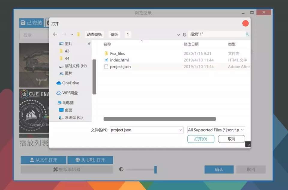 如果需要添加更多壁纸,点击软件下方的 “ 从文件打开 ” 直接添加,可添加「.json」和「.html」两种格式,这两种都可以直接添加设置成壁纸。