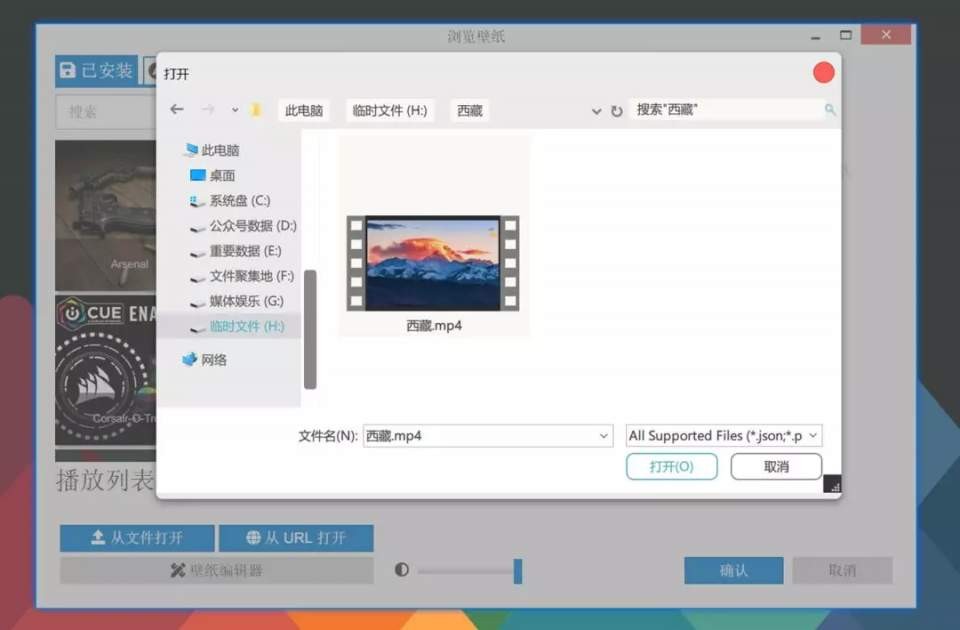 而它最强大的是下面这个自定义动态壁纸,你还可以将任何一段视频直接设置成桌面壁纸,譬如下面这个西藏美景视频。用同样的方式,点击 “ 从文件打开 ” ,选择视频,点击 “ 打开 ” 即可完成设置。