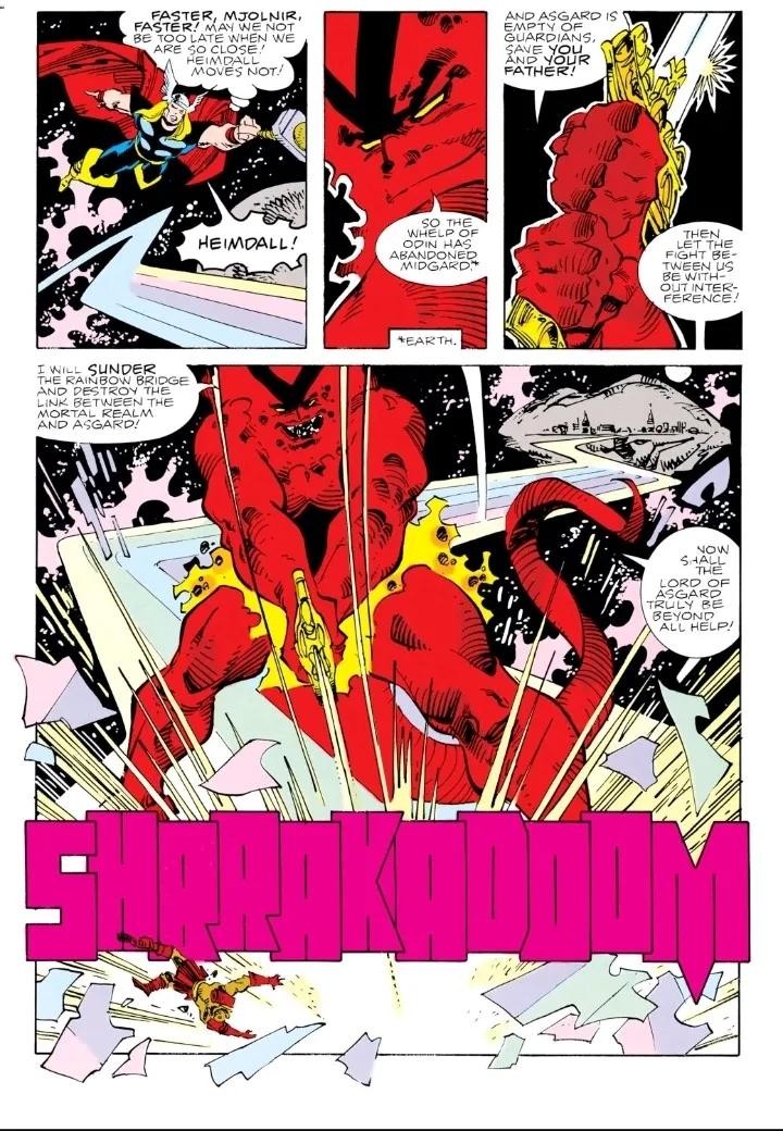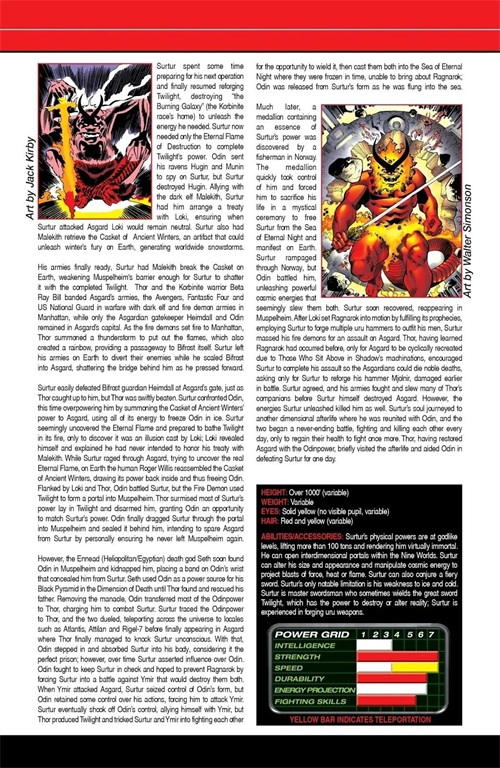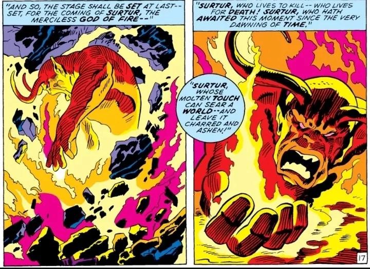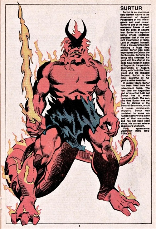 苏尔特尔是一个巨大的炽热恶魔,原产于阿斯加德 维度。拥有邪恶的智慧和巨大的力量,是阿斯加德诸神撕裂的邪恶之火。 苏尔特尔是一个神秘的存在,其存在早于阿斯加德之王奥丁的当前化身。身高超过一千英尺,挥舞着巨大的飞剑,苏尔图尔被奥丁囚禁在地心。 在诸神都在诸神黄昏,阿斯加德的周期性毁灭之后,用火烧毁阿斯加德。与冰霜巨人尤米尔和米德加德巨蛇一起,苏尔特尔是阿斯加德最强大的本土敌人。