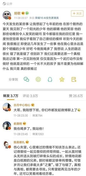 胡歌的微博,最初只是怀念感慨和提出一点质疑,完全在公众可接受范围内,并没有什么问题。