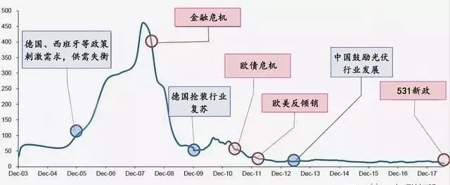 国内外光伏政策影响着整个光伏行业的发展,形成了一个政策驱动的光伏周期。下图是不同政策周期下的硅原料价格:在光伏行业刚刚兴起的时候,硅料产能严重不足,需求一大,硅料价格就猛涨。而在硅料价格大涨的刺激下,硅料产能迅速扩大,等到2012年的行业又一个低谷的时候,硅料产能严重过剩,导致即便需求上来之后,硅料价格也依然维持低位。这也就是目前组件价格可以持续维持在低位的一个重要因素。