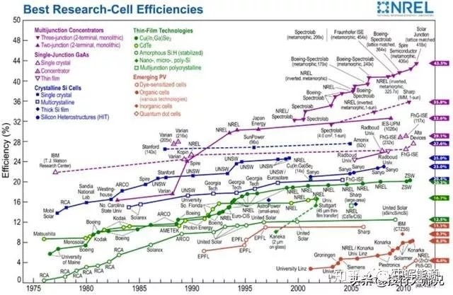 科技进步使得光伏组件的转化效率和制造良率,产能都会有极大的提升,从而提现到组件价格的持续下降。下图是各大光伏技术路线的转化效率演变图: