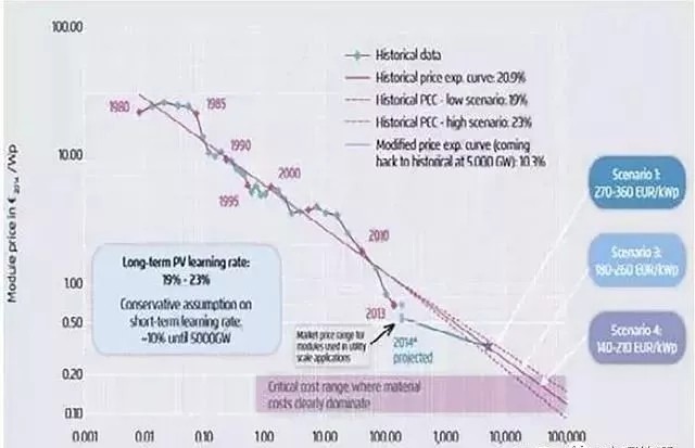随着全球光伏产业的大规模扩张使得成本呈指数级下降。根据历史数据,装机规模每增加100%,电池组件成本下降20.9%。光伏组件价格从1977年时的76.67美元/瓦降至如今的0.146美元/瓦。
