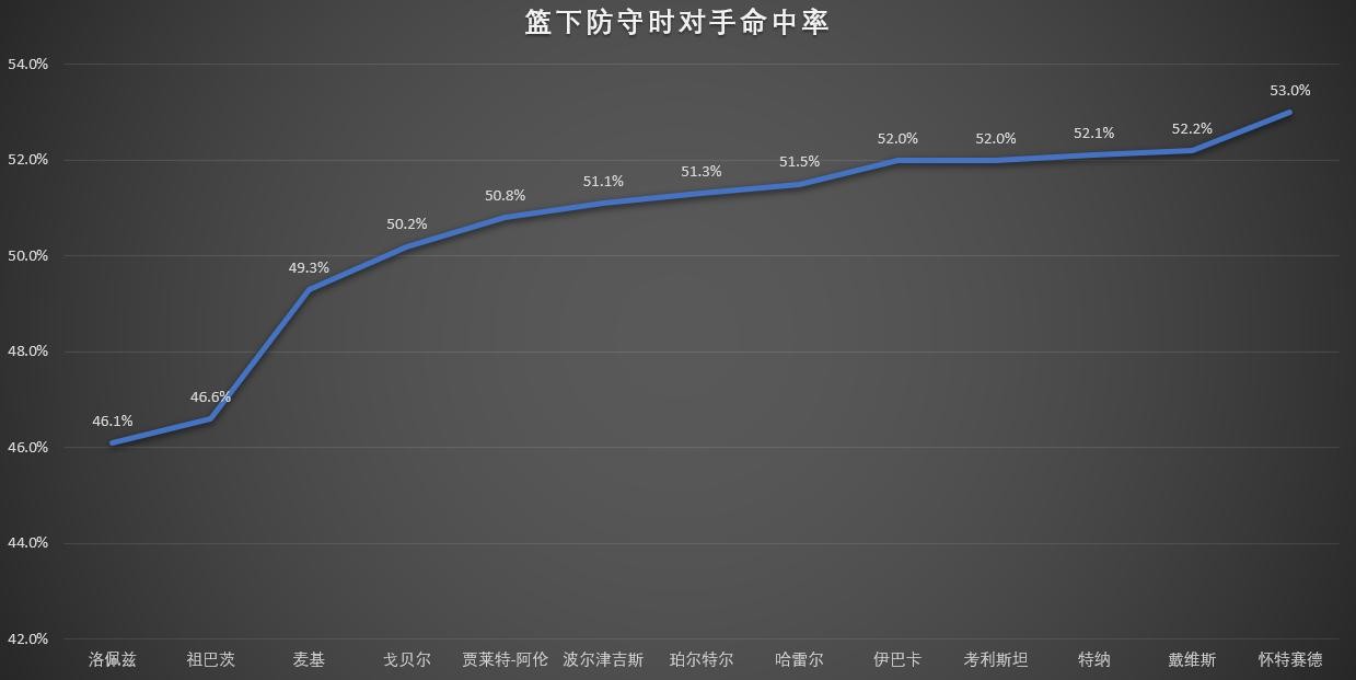 在篮下小于十英尺和小于六英尺范围内,洛佩兹将对手的命中率限制明显