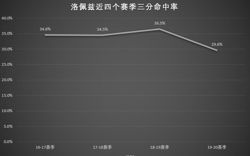 洛佩兹近四个赛季的三分命中率都达到了35%左右,但本赛季突然降低到了30%以下
