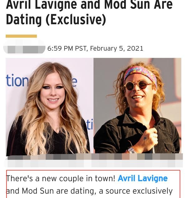 这位新欢是比艾薇儿小三岁男歌手Mod Sun,据知情人士表示,两人是通过合作让关系变得亲密,久而久之,两人相恋,便从合作伙伴发展成为恋人。