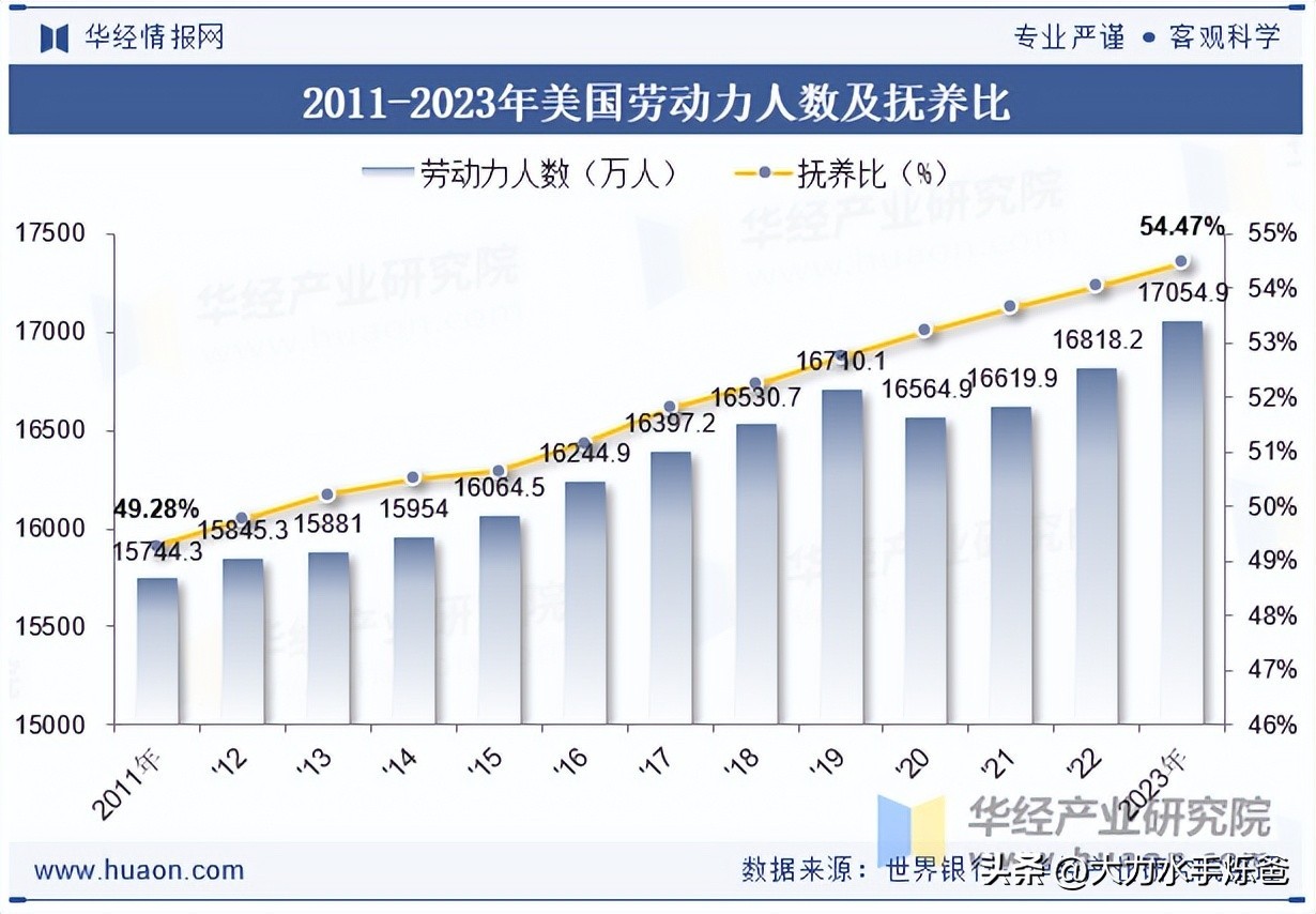 2023年美国劳动力(所有年满15周岁、符合国际劳工组织对从事经济活动人口所作定义的群体)人数为17054.89万人,同比2022年增长了236.69万人,抚养比(占劳动年龄人口的百分比)为54.47%,与2011年相比每个劳动力人口需要承担更多的抚养责任。