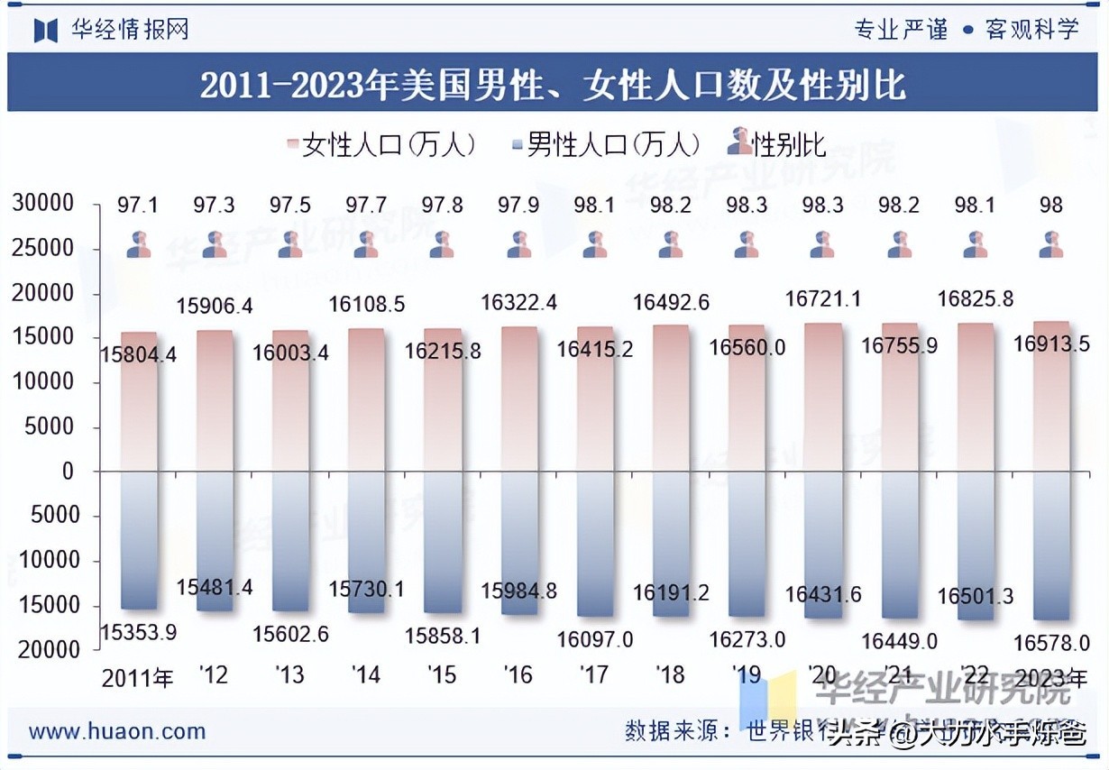 从性别结构来看,2023年美国男性、女性人口数量占总人口的比重分别为:49.5%、50.5%。2023年美国男性人口数量为16578万人,比上年增长了76.67万人;女性人口数量为16913.49万人,比上年增长了87.68万人;男女性别比(以女性为100,男性对女性的比例;下同)为98.02。