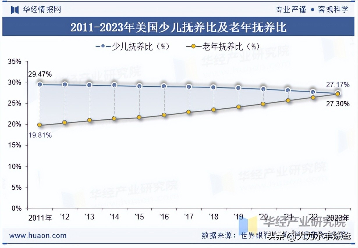 2023年美国老年人口比例增加,已步入老龄化社会,老年抚养比呈现上升趋势2023年老年抚养比(65岁及以上人口占工作年龄人口的比例)为27.17%;少儿抚养比(0-14岁人口占工作年龄人口的比例)从2011年的29.47%下降至2023年的27.3%,比上年下降了0.36个百分点。