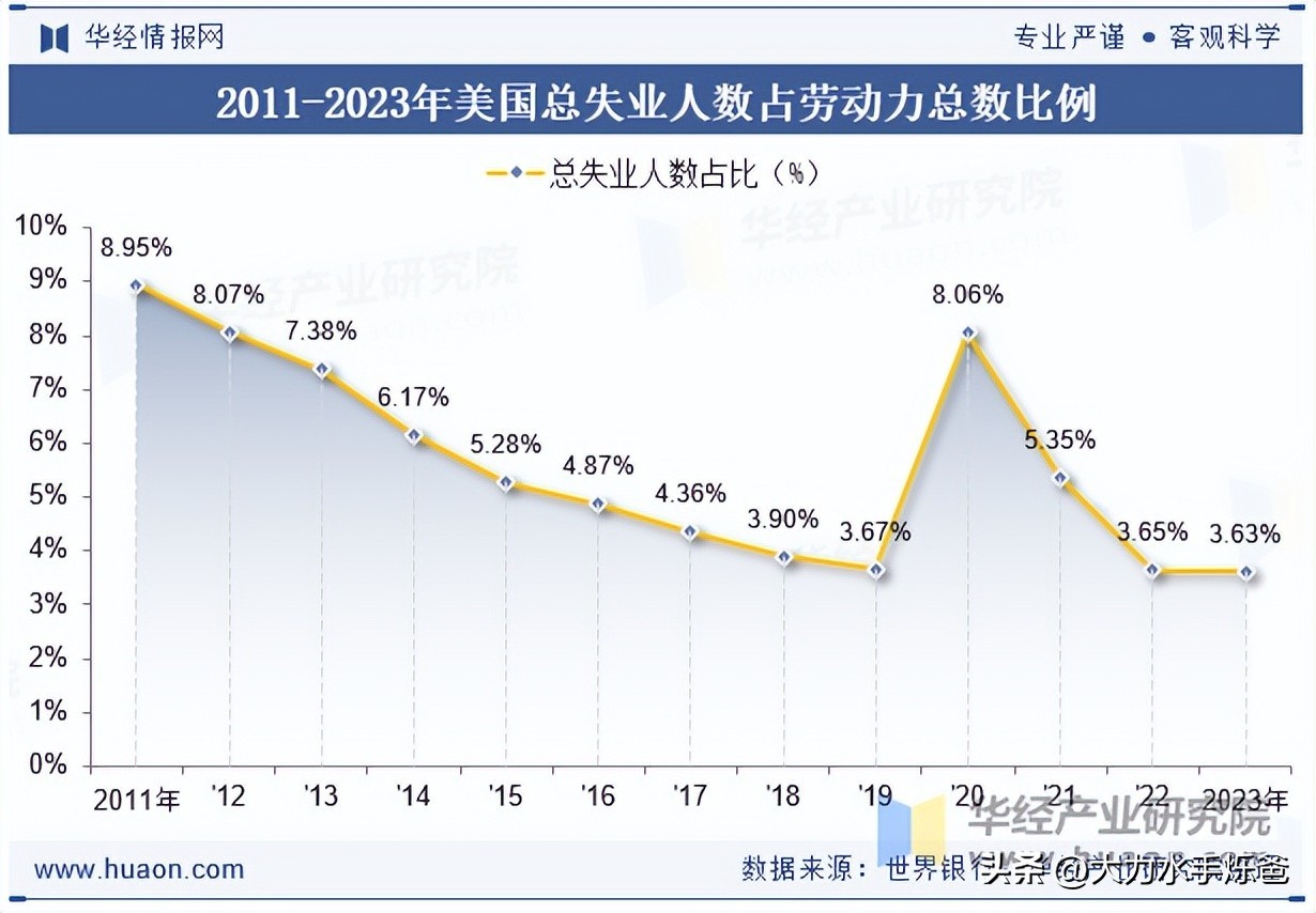 2023年美国总失业人口占比(占劳动力总数的比例)为3.63%,比上年下降了0.02个百分点,较2011年相比下降至5.32个百分点。