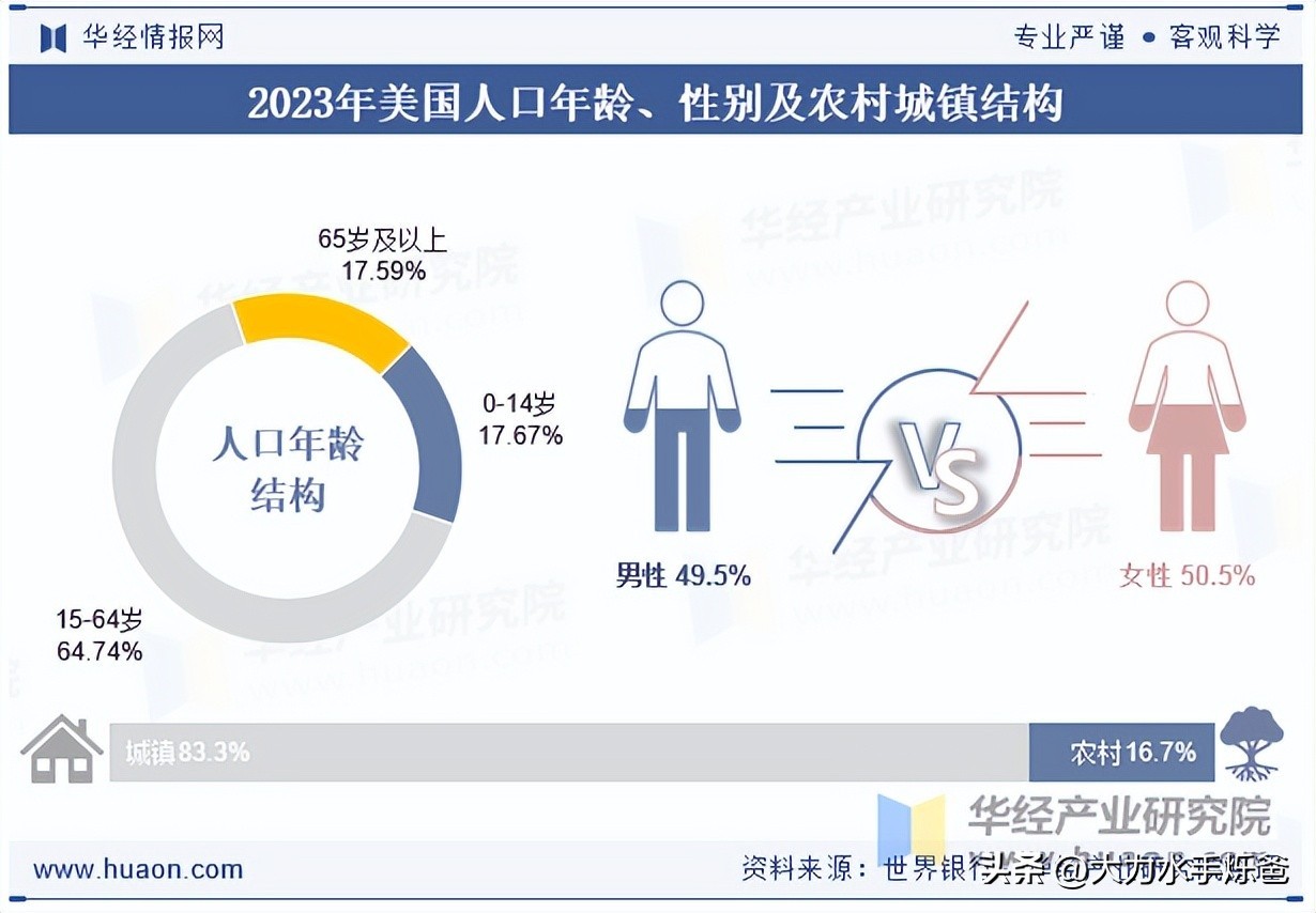 从年龄构成来看,2023年美国0-14岁人口、15-64岁人口、65岁及以上人口占总人口数量的比重分别为:17.67%、64.74%、17.59%,较上年分别:下降0.29个百分点、下降0.17个百分点、增长0.46个百分点。