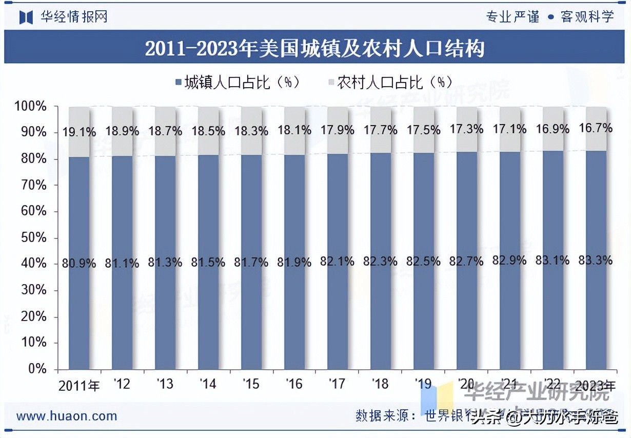 从城乡结构来看,2023年美国农村、城镇人口占总人口的比重分别为:16.7%、83.3%。2023年美国农村人口数为5593.75万人,比上年减少了43.87万人,农村人口下降(年增长率)0.78%;城镇人口数为27897.74万人,比上年增长了208.22万人,城镇人口增长(年增长率)0.75%。