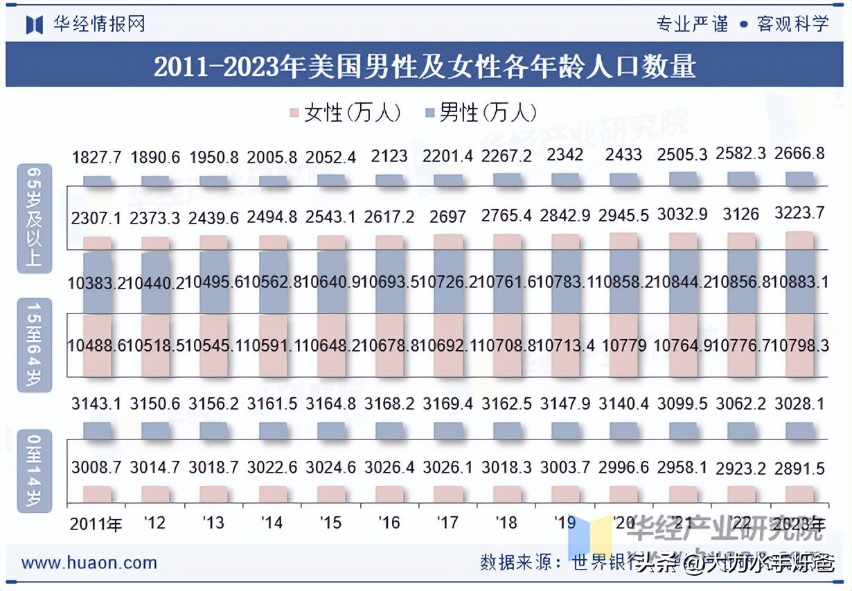 2023年美国0-14岁人口数量为5919.56万人,相比上年减少了65.81万人;其中男性人口数量为3028.06万人,女性人口数量为2891.5万人,男女性别比为104.72。15-64岁人口数量为21681.47万人,相比上年增长了48.01万人;其中男性人口数量为10883.14万人,女性人口数量为10798.33万人,男女性别比为100.79。65岁及以上人口数量为5890.46万人,比上年增长了182.15万人;其中男性人口数量为2666.79万人,女性人口数量为3223.66万人,男女性别比为82.73。