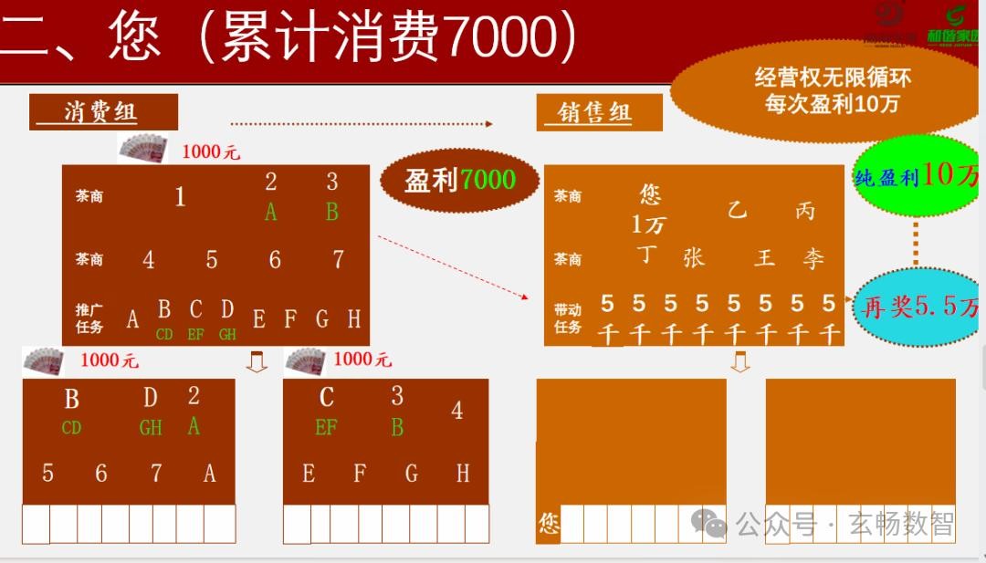 在理想华莱的体系中,我们有两种主要的盈利路径:消费组和销售组。消费组的目标是赚取8000元,而销售组则有机会赚取10万元的收益。