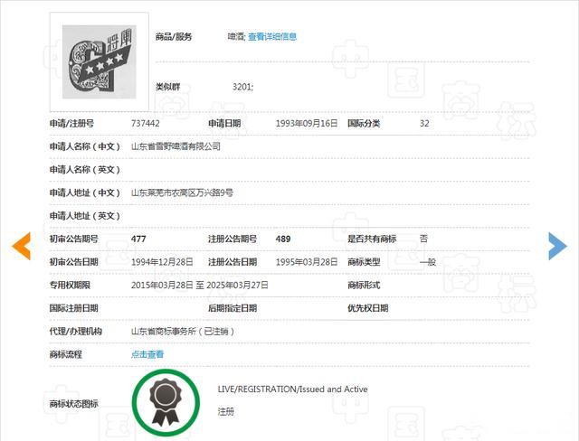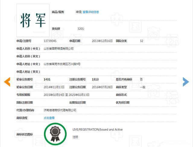 2005年3月及2015年2月,雪野公司分别注册取得第737442号“将军”及图商标、第13739045号“将军”商标,核定使用的商品均包括啤酒。