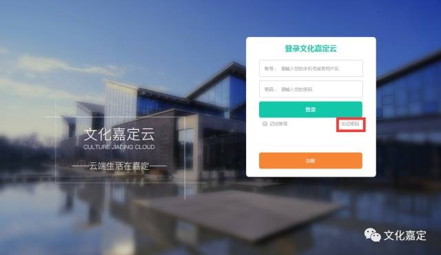 请在“文化嘉定云”网站登录页面点击“忘记密码”,进入密码修改页;