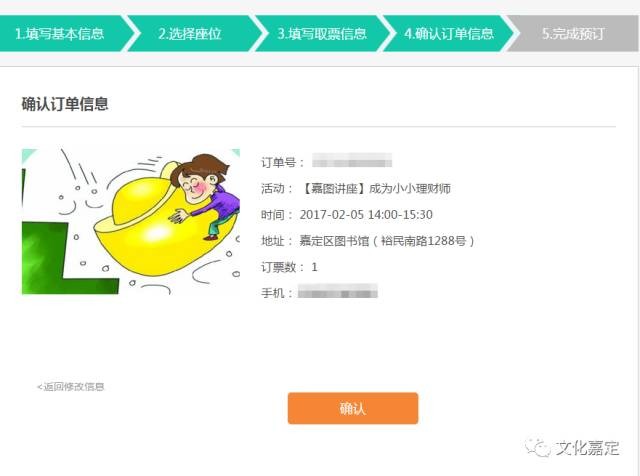 进入“确认订单信息”页面,再次确认信息无误后,点击“确认”,完成预订,可进入“个人中心”查看预订详情。(如果发现订单信息有误,请点击“返回修改信息”进行修改。)