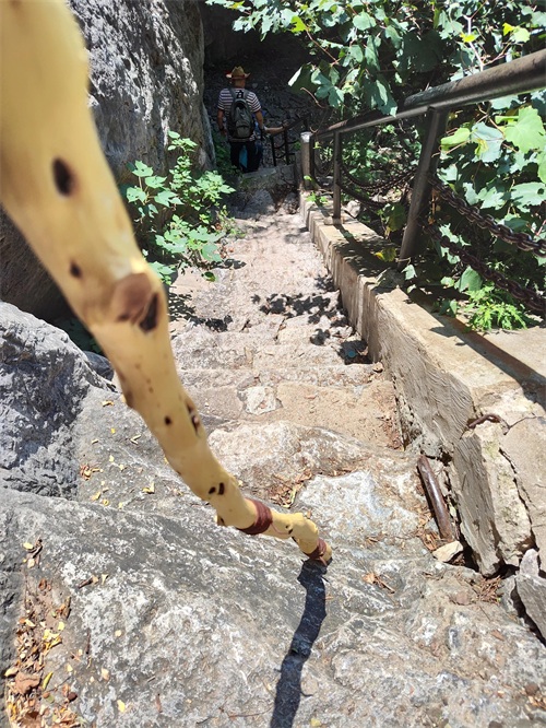 莲台山多的是洞,修路或者凿石阶出来都是沿石壁,陡峭。需要登山杖助力。很多台阶短而耸,台阶宽度只容下鞋跟,光滑,部分路上没有护栏,需登山杖保命。