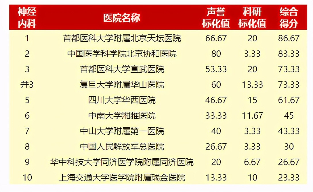 北京地区医院入围情况:神经内科1、天坛医院2、协和医院3、宣武医院8、解放军总医院,神经外科1、天坛医院4、宣武医院5、解放军总医院、10中日友好医院