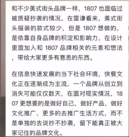 说到抄袭当时“1807”的主理人发文说到:我觉得美式街头的款式较少,1807想要做的是自己往里面加入一些1807的元素