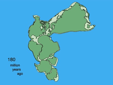 魏格纳在经过对多地的考察和研究后认为:在距今359—252百万年的石炭—二叠纪,地球表面有一个统一的大陆,称为潘基亚大陆。从2亿年前的侏罗纪开始,潘基亚大陆被分裂成若干的块体,并且各自漂移,最终变成了今天的布局。