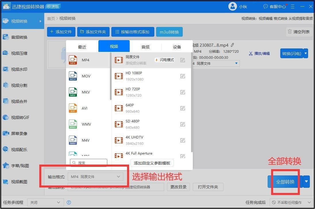 3、最后将视频输出格式选择MP4格式,然后点击“全部转换”,m3u8视频就会转成MP4格式视频啦。