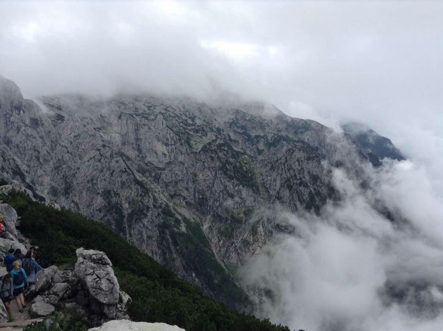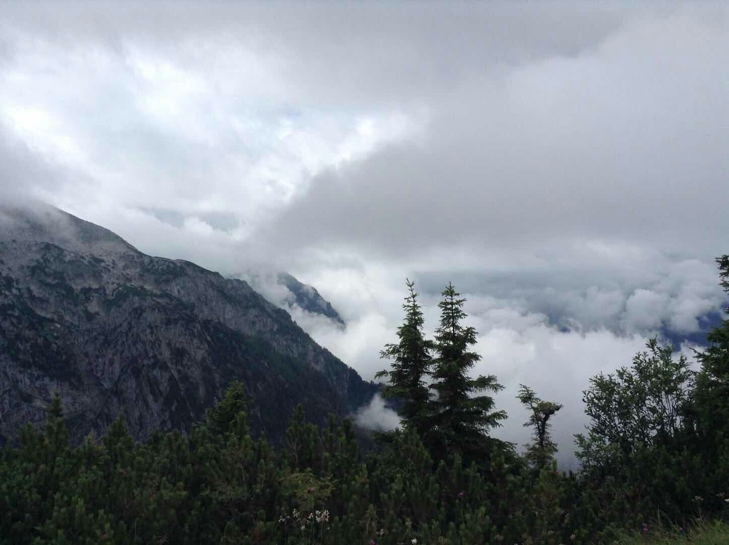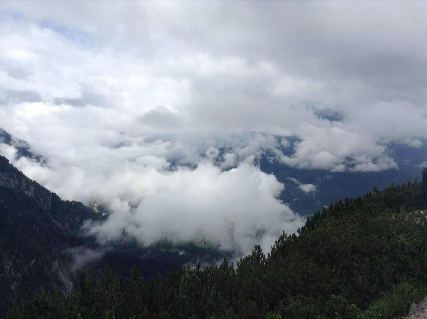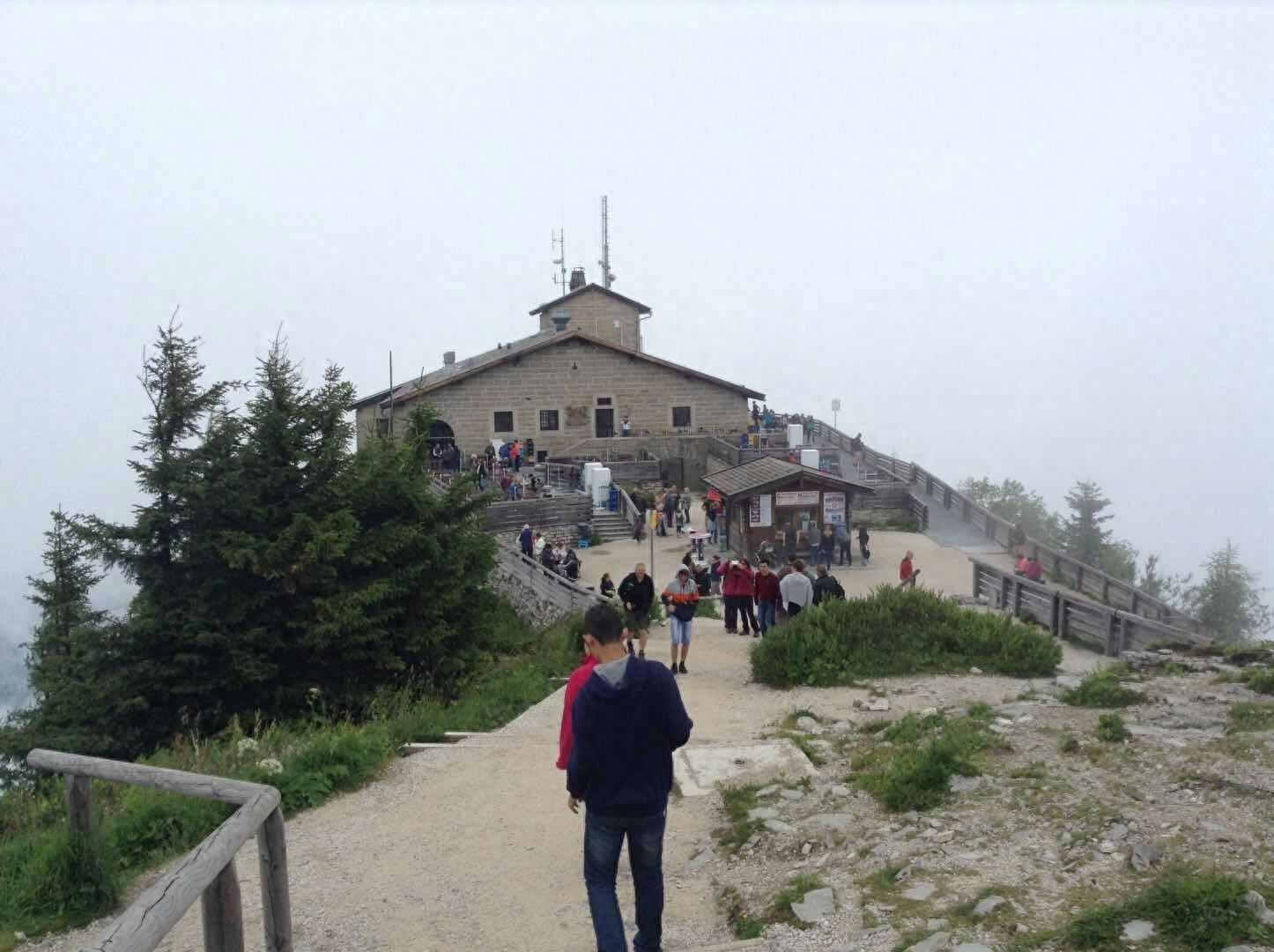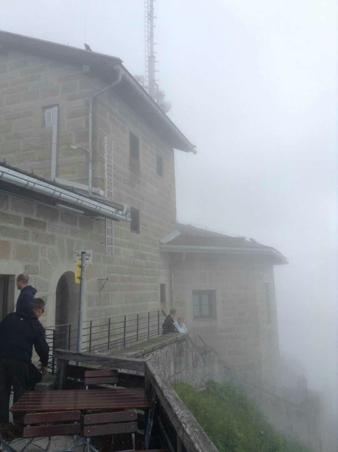 山顶上云雾缭绕,有风有点儿冷,我们还穿上了外套。和欧洲的很多山上一样,这里也有一个大大的十字架,可能是因为高处离上帝更近吧。据说视线好的时候,从山顶向下望能看到国王湖和萨尔茨堡城,我们去的时候雾比较大,没看到湖。但是看到鹰了,据说当年因为这个地方比较高,只有鹰才能飞上来,并且纳粹的标记也是鹰,所以才把这栋建筑物命名为鹰巢。