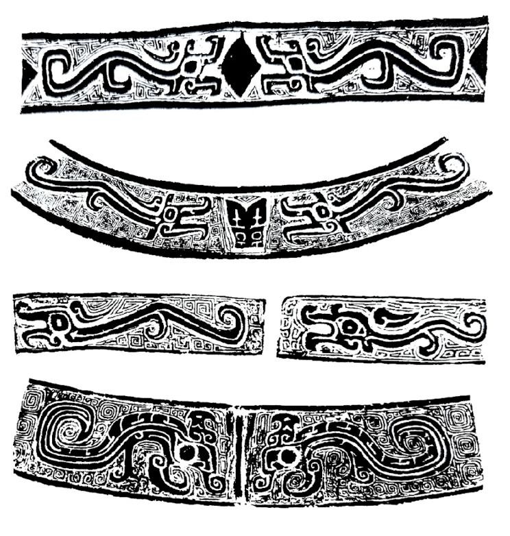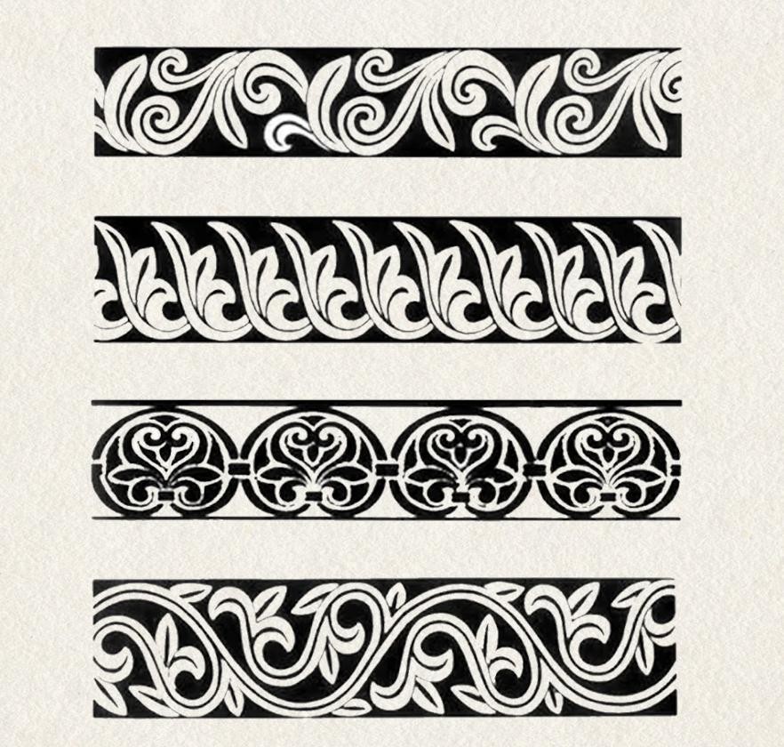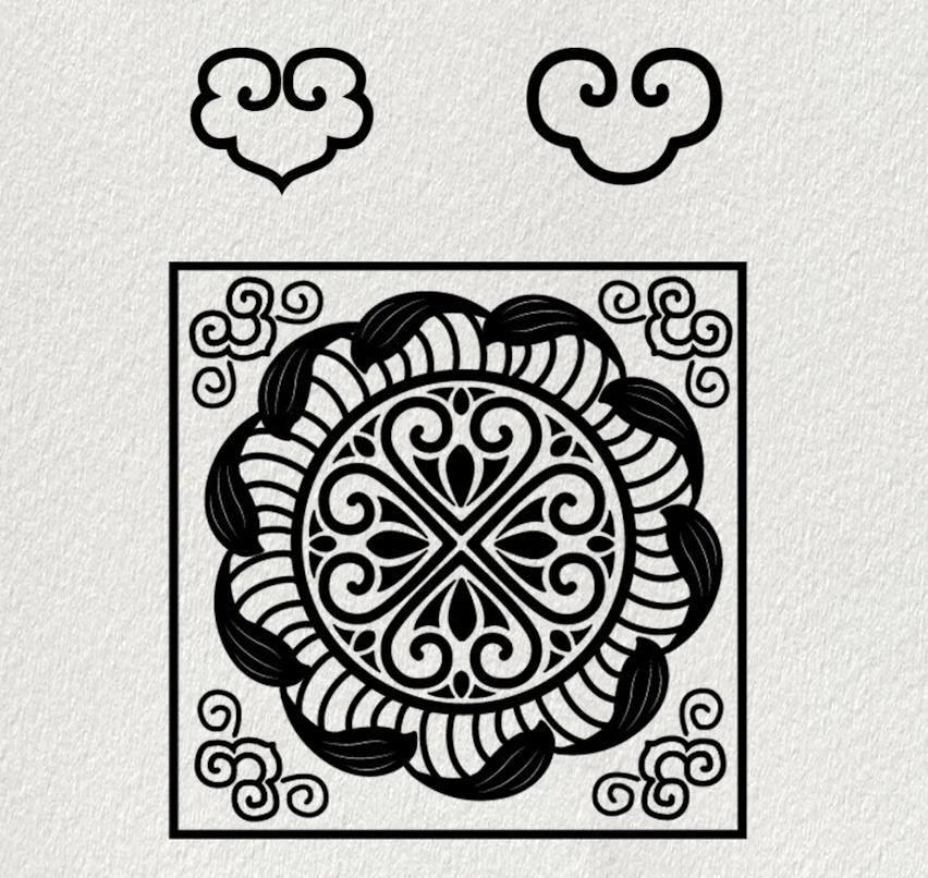 云雷纹、祥云纹、环带纹、忍冬纹、凤鸟纹、如意纹、饕餮纹、方胜纹、唐草纹、曲水纹、垂鳞纹、万字纹、缠枝纹、云头纹、八宝纹、寿字纹。