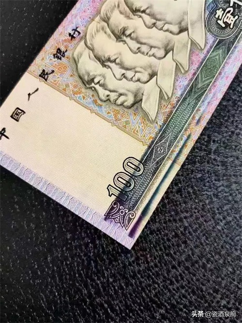 这是四版人民币1990年100元,左下角有两条黑色的漏墨印痕,颜色与底纹一致,而且深浅过渡有致,绝非人为形成。