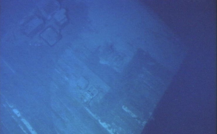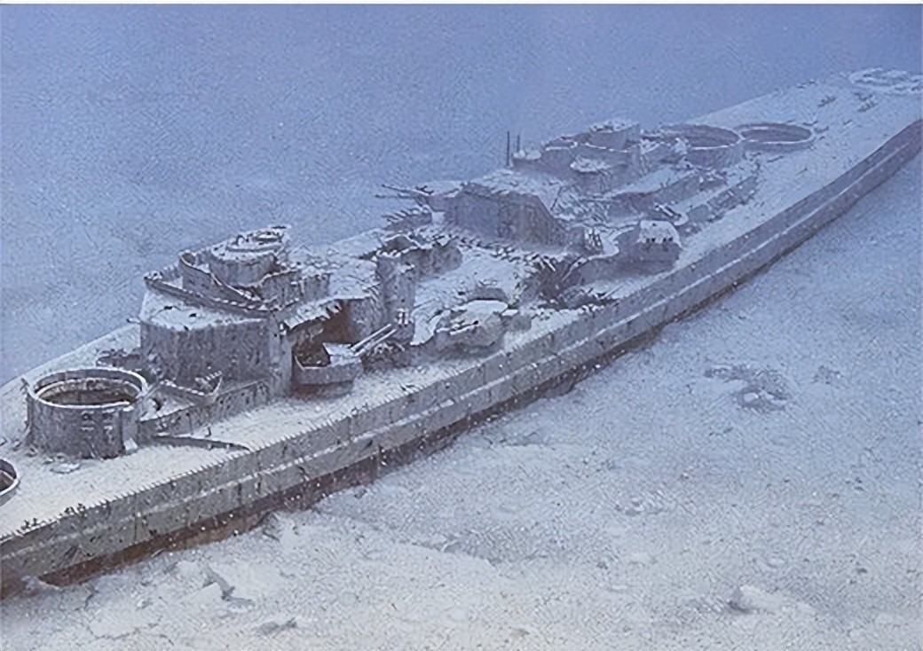 俾斯麦号战列舰的残骸的全景,舰上的主炮炮塔都已失踪,因为在下沉时发生脱落。