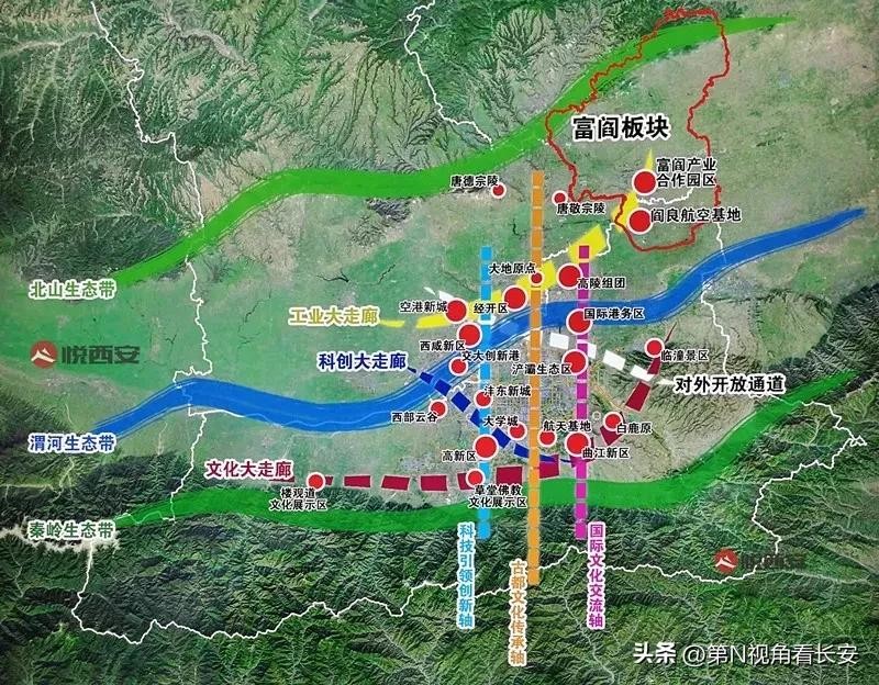 发挥西安核心辐射带动作用,增强高陵、阎良、富平、三原、耀州等节点人口和产业聚集能力,形成高效串联西安、渭北和铜川的南北向经济发展轴。