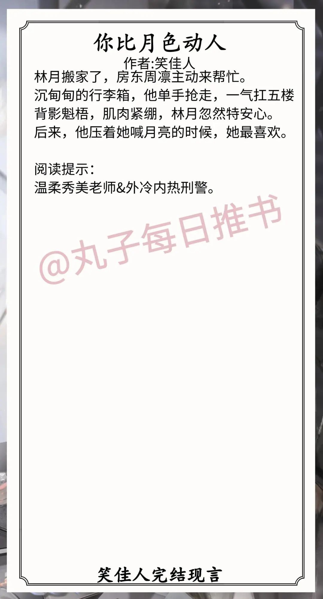 3.《你比月色动人》作者:笑佳人(温柔秀美老师vs外冷内热刑警,同居梗,日久生情,都市甜宠文)