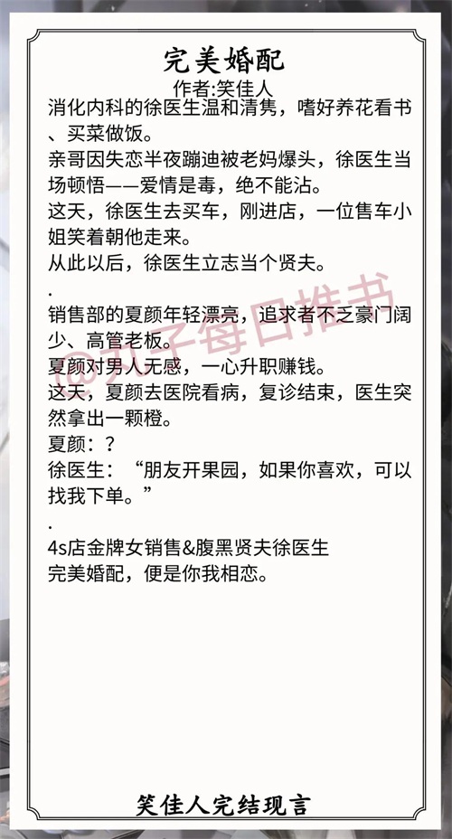 2.《完美婚配》作者:笑佳人(娇俏美丽女销售vs腹黑温柔男医生,一见钟情,都市甜宠文,轻松欢脱风)