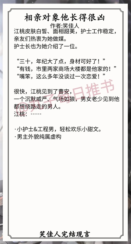 1.《相亲对象他长得很凶》作者:笑佳人(乖巧软萌女护士vs高大威猛工程师,相亲梗,男套路女,暧昧拉扯,都市甜宠文)